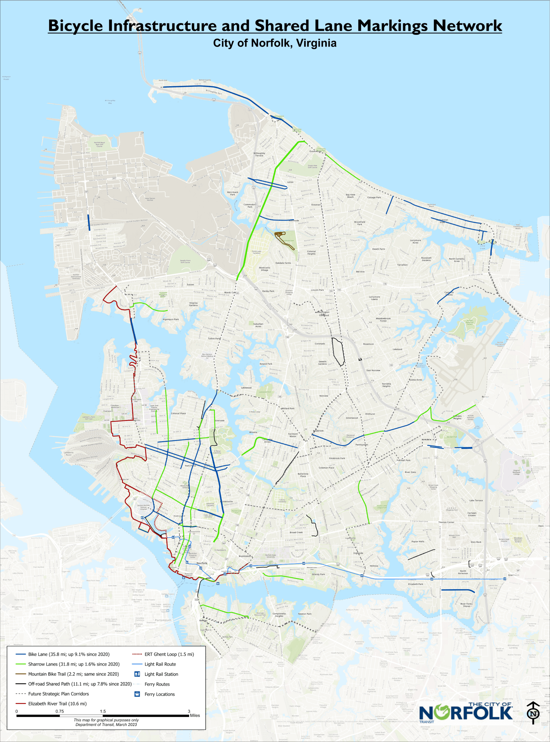 Over the past two decades, the City of Norfolk has made a number of investments and improvements to expand the network of bicycling facilities in the city. Since the adoption of the 2015 Strategic Plan, the City has been working to implement the recommendations on several of the key corridors identified in the plan.