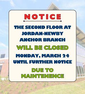 The Jordan-Newby Anchor Branch second floor is closed today, March 24 until further notice for maintenance.