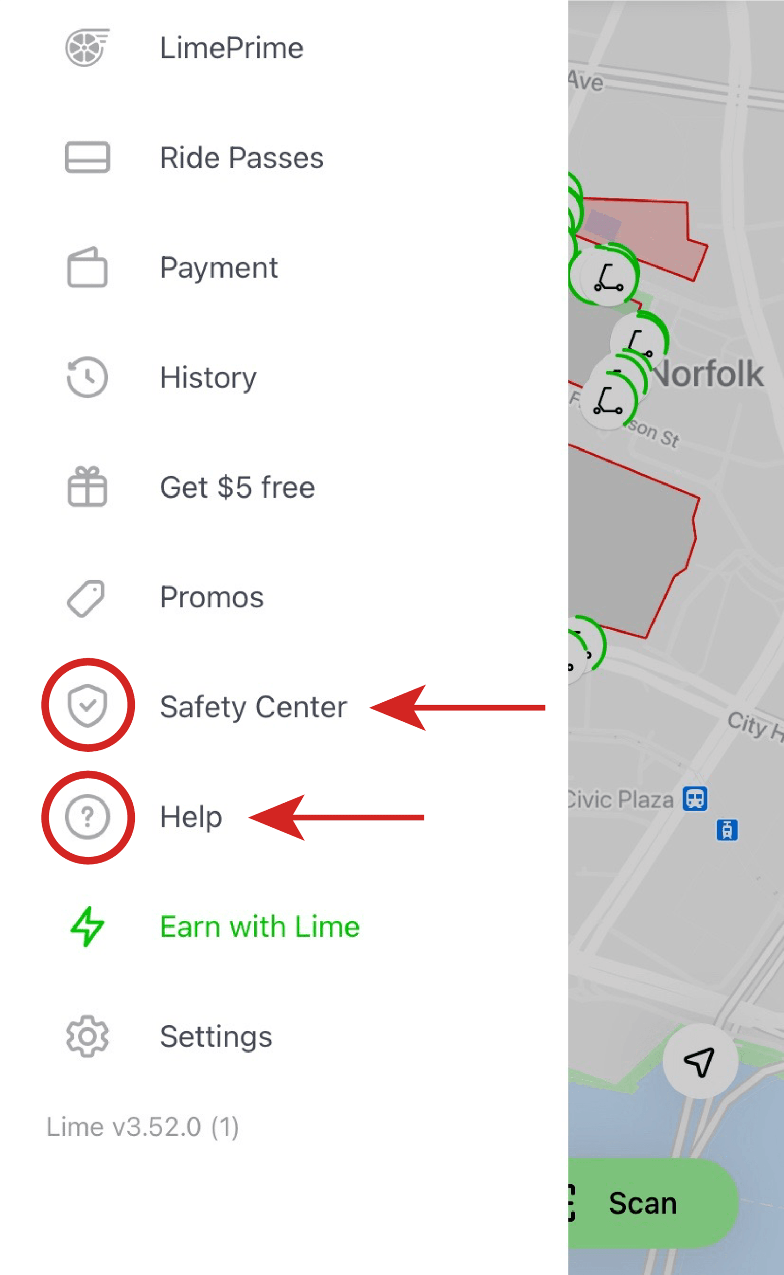 Reference the images below for how to submit a concern through the Lime app via the "Safety Center" and "Help" buttons.