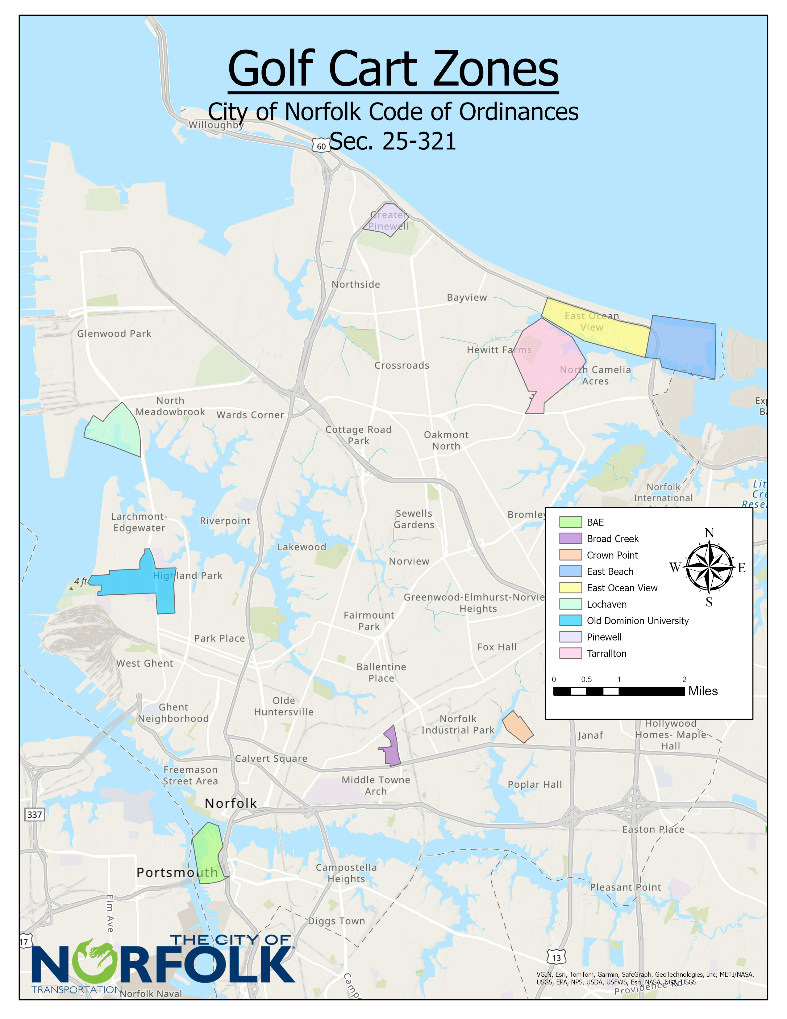 Please be aware that the City of Norfolk Code of Ordinances Sec. 25-322. - Limitations on golf cart operations on designated highways, Sec. 25-323. - When limitations not applicable, Sec. 25-324. - Insurance requirement, and Sec. 25-325. - Penalties.